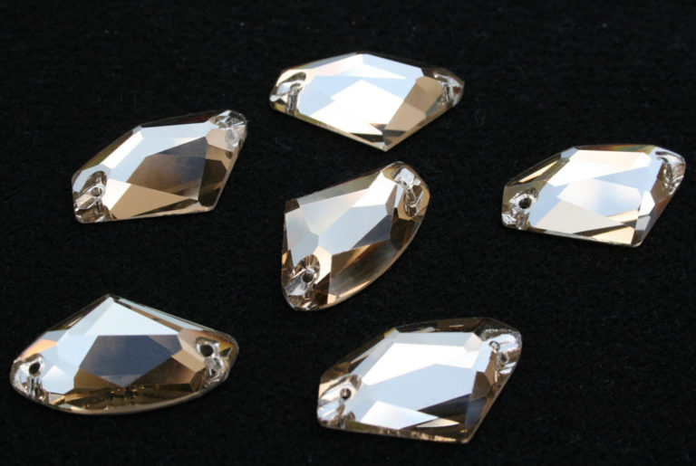 Ék alakú varrható kristálykő halvány aranyszínben, 16x27 mm-es méretben. Csillogó fényű, különleges csiszolású kő. Anyaga: kristályüveg.