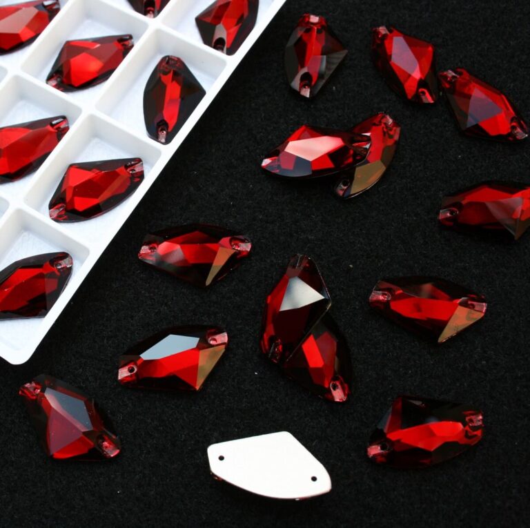 Tört rombusz alakú varrható kristálykő élénkpiros színben, 14x18, 16x20, 21x26, 27x34 mm-es méretben. Prémium csiszolású kő. Anyaga: kristályüveg.