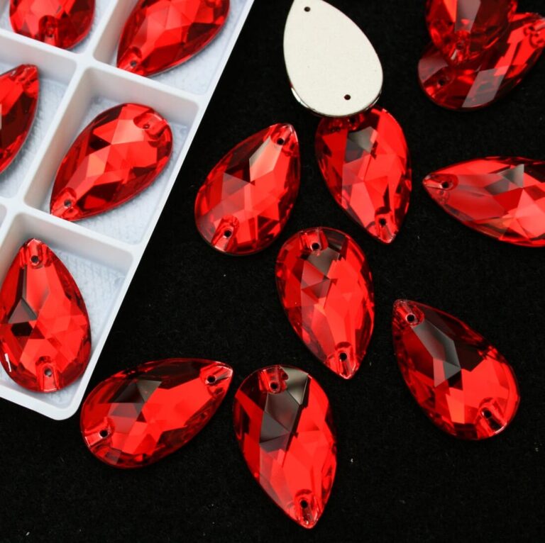 Csepp alakú varrható kristálykő piros színben, 7x12, 10,5x18, 13x22, 17x28 mm-es méretben. Szikrázó fényű, prémium kő. Anyaga: kristályüveg.