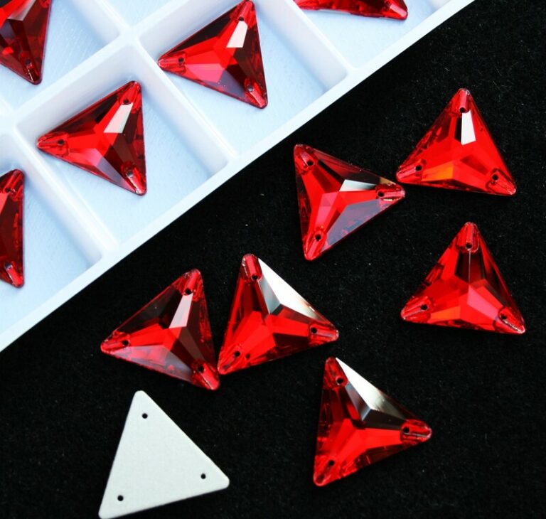 Háromszög alakú varrható kristálykő piros színben, 12x12, 16x16, 22x22 mm-es méretben. Prémium csiszolású kő. Anyaga: kristályüveg.