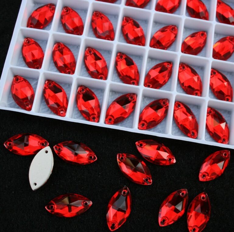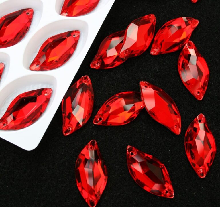 Zabszem alakú varrható kristálykő piros színben, 9x18 mm-es méretben. Szikrázó fényű, ragyogó csiszolású kő. Anyaga: kristályüveg.