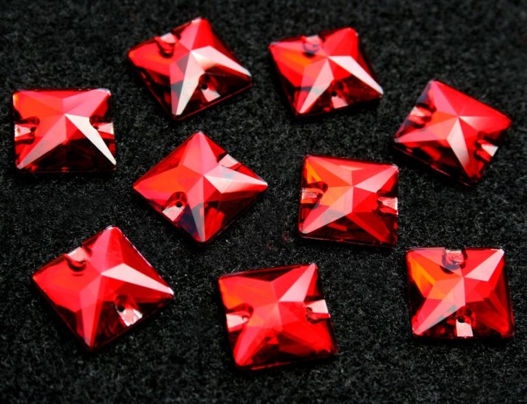 Négyzet alakú varrható kristálykő piros színben, 12x12, 16x16, 22x22 mm-es méretben. Szikrázó, prémium csiszolású kő. Anyaga: kristályüveg.