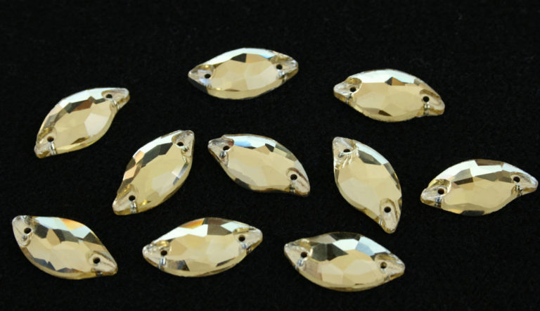 Levél alakú varrható kristálykő halványsárga/pezsgő színben, 10x20 mm-es méretben. Szikrázó, különleges csiszolású kő. Anyaga: kristályüveg.