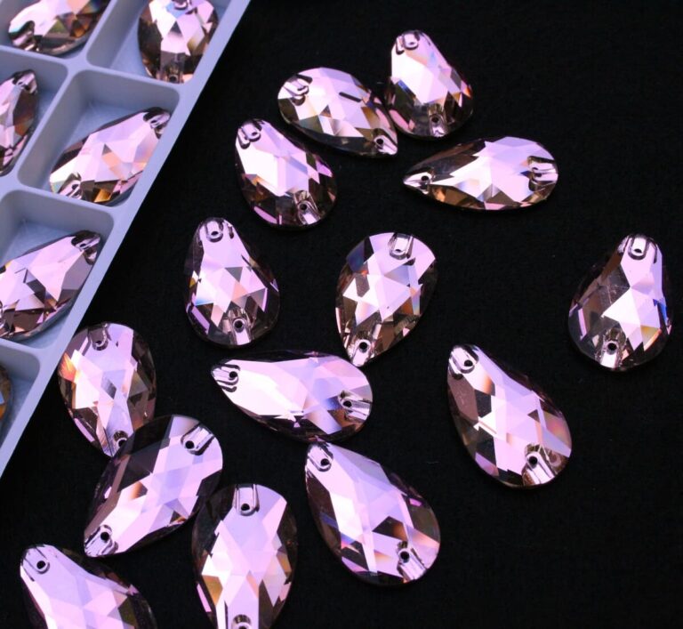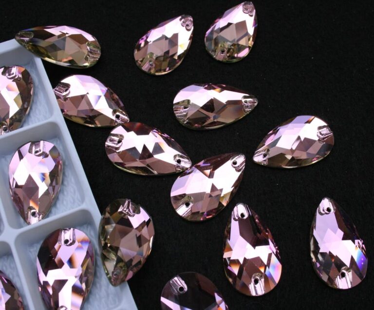 Csepp alakú varrható kristálykő világos rózsaszín színben, 7x12, 10,5x18, 13x22, 17x28 mm-es méretben. Szikrázó fényű kő. Anyaga: kristályüveg.