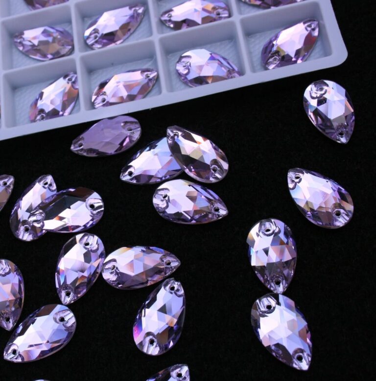 Csepp alakú varrható kristálykő halványlila színben, 7x12, 10,5x18, 17x28 mm-es méretben. Szikrázó fényű kő. Anyaga: kristályüveg.