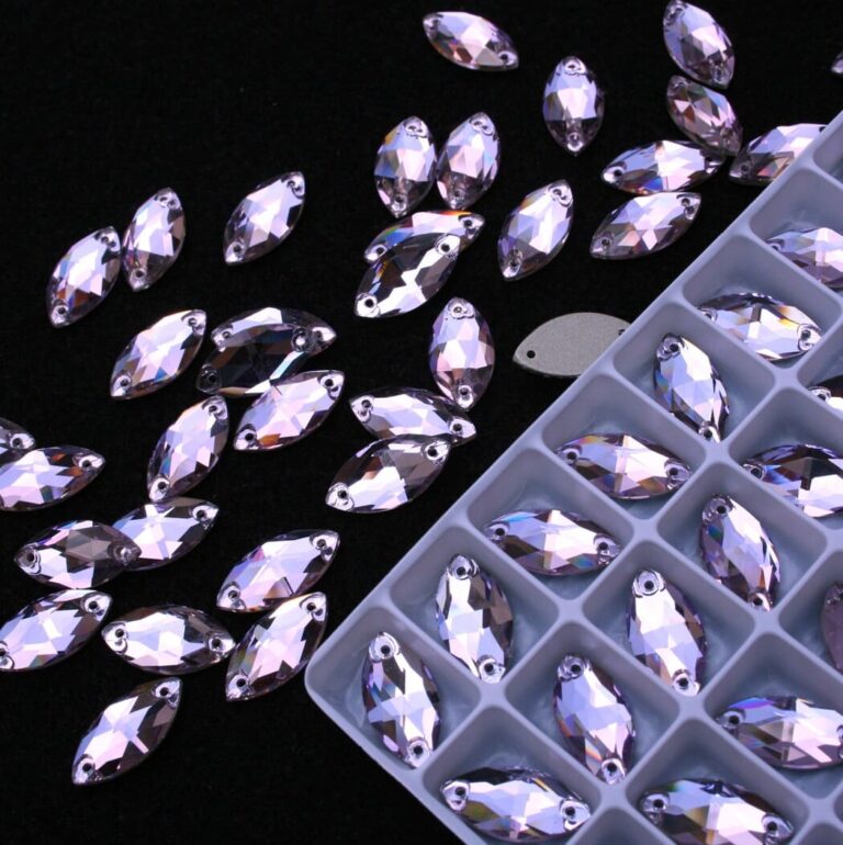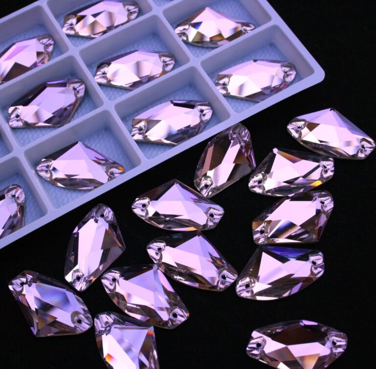 Ék alakú varrható kristálykő halványlila színben, 16x27 mm-es méretben. Csillogó fényű, különleges csiszolású kő. Anyaga: kristályüveg.