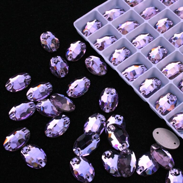 Ovális alakú varrható kristálykő halványlila színben, 11x16, 17x24 mm-es méretben. Csillogó, prémium csiszolású kő. Anyaga: kristályüveg.