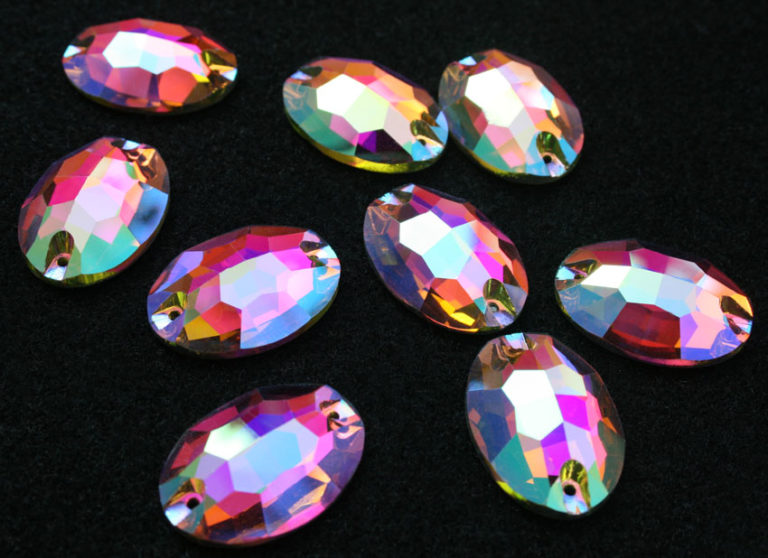 Ovális alakú varrható kristálykő rózsaszín színben, AB bevonattal, 11x16, 17x24 mm-es méretben. Prémium csiszolású kő. Anyaga: kristályüveg.