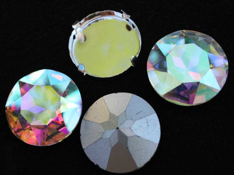 Kör alakú, rivoli metszésű foglalatos kristálykő kristály színben, 16 és 18 mm-es méretben, 3 D-s csiszolással. Anyaga: kristályüveg.