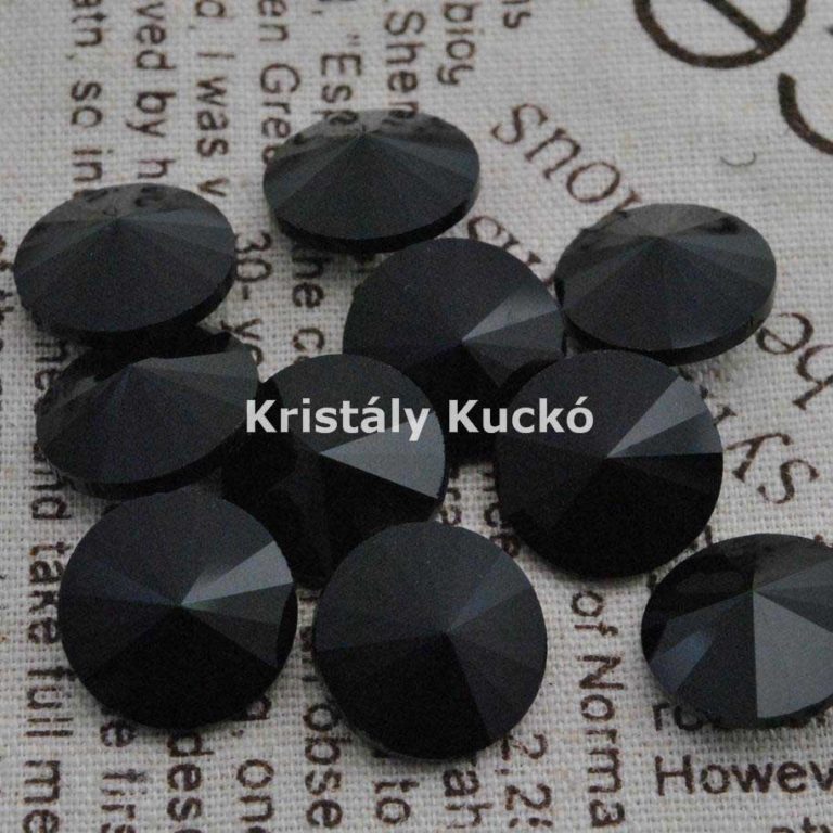 Kör alakú, rivoli metszésű foglalatos kristálykő fekete színben, 16 mm-es méretben, ezüstszínű foglalattal, 3 D-s csiszolással. Anyaga: kristályüveg.