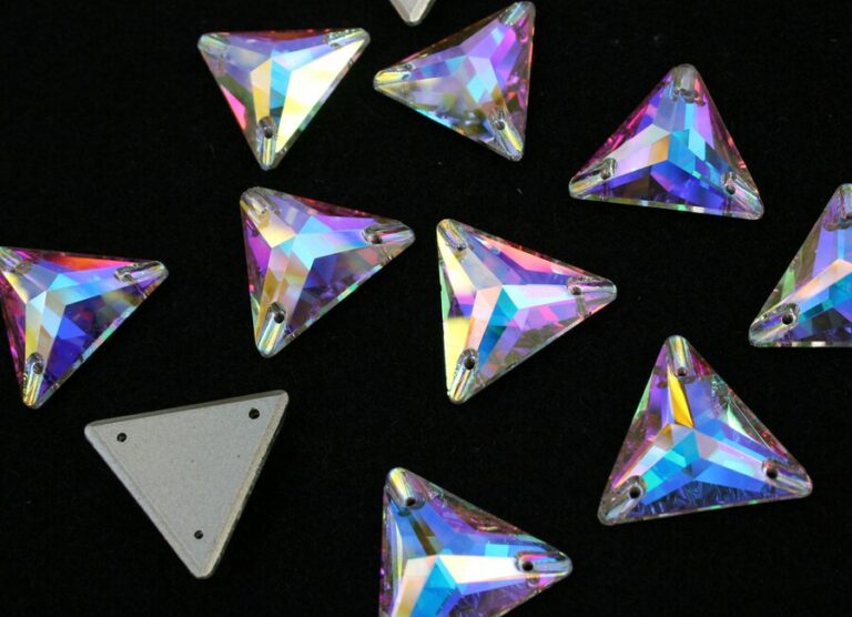 Háromszög alakú varrható kristálykő kristály AB színben, 12x12, 16x16, 22x22 mm-es méretben. Ragyogó, új csiszolású kő. Anyaga: kristályüveg.