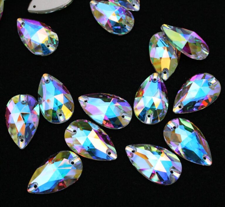 Csepp alakú varrható kristálykő kristály AB színben, 7x12, 10,5x18, 13x22, 17x28 mm-es méretben. Prémium csiszolású kő. Anyaga: kristályüveg.