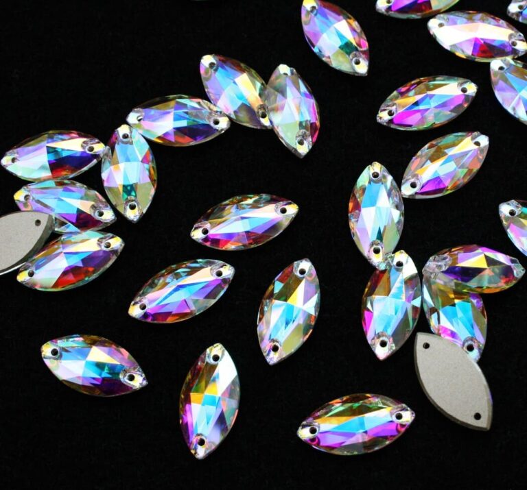 Zabszem alakú varrható kristálykő kristály AB színben, 7x15, 9x18, 15x32 mm-es méretben. Szikrázó fényű, ragyogó csiszolású kő. Anyaga: kristályüveg.