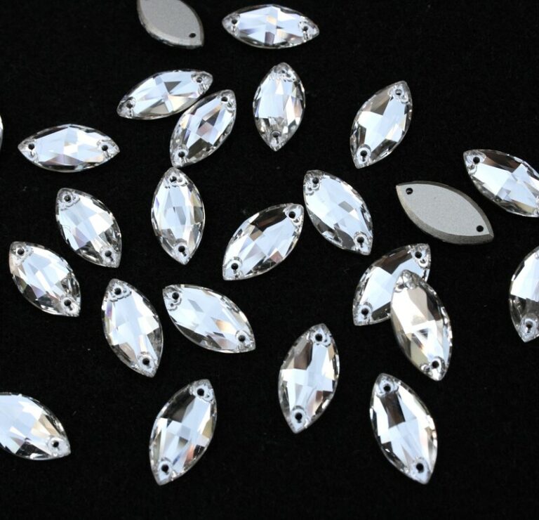 Zabszem alakú varrható kristálykő kristály színben, 7x15, 9x18, 15x32 mm-es méretben. Szikrázó fényű, ragyogó csiszolású kő. Anyaga: kristályüveg.