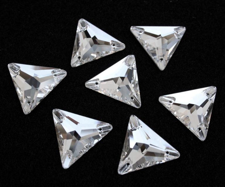 Háromszög alakú varrható kristálykő kristály színben, 12x12, 16x16, 22x22 mm-es méretben. Ragyogó, új csiszolású kő. Anyaga: kristályüveg.