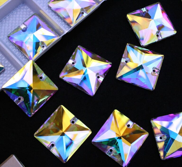 Négyzet alakú varrható kristálykő kristály AB színben, 10x10, 12x12, 14x14, 16x16, 22x22 mm-es méretben. Prémium minőség. Anyaga: kristályüveg.