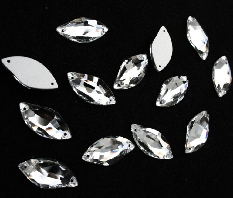 Levél alakú varrható kristálykő kristály színben, 10x20, 15x30 mm-es méretben. Szikrázó fényű, prémium csiszolású kő. Anyaga: kristályüveg.