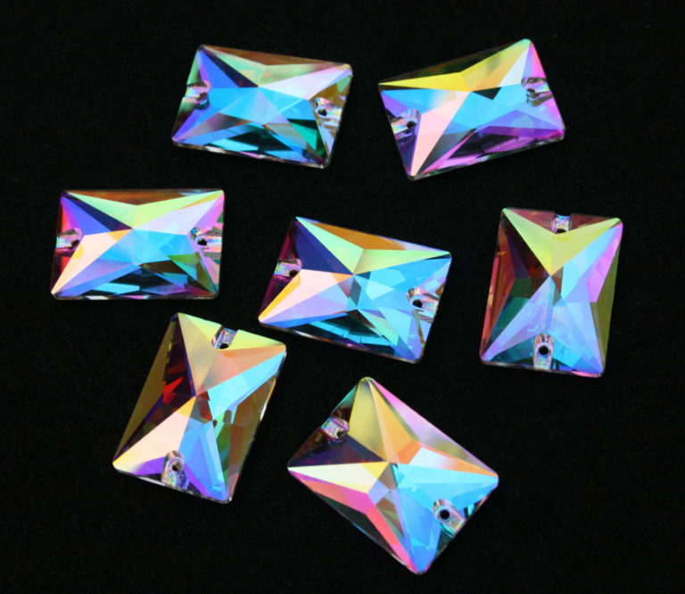 Téglalap alakú varrható kristálykő kristály AB színben, 10x14, 13x18, 18x25 mm-es méretben. Prémium csiszolású, csillogó kő. Anyaga: kristályüveg.