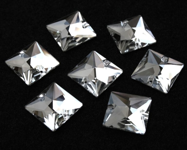 Négyzet alakú varrható kristálykő kristály színben, 10x10, 12x12, 14x14, 16x16, 22x22 mm-es méretben. Prémium csiszolású kő. Anyaga: kristályüveg.