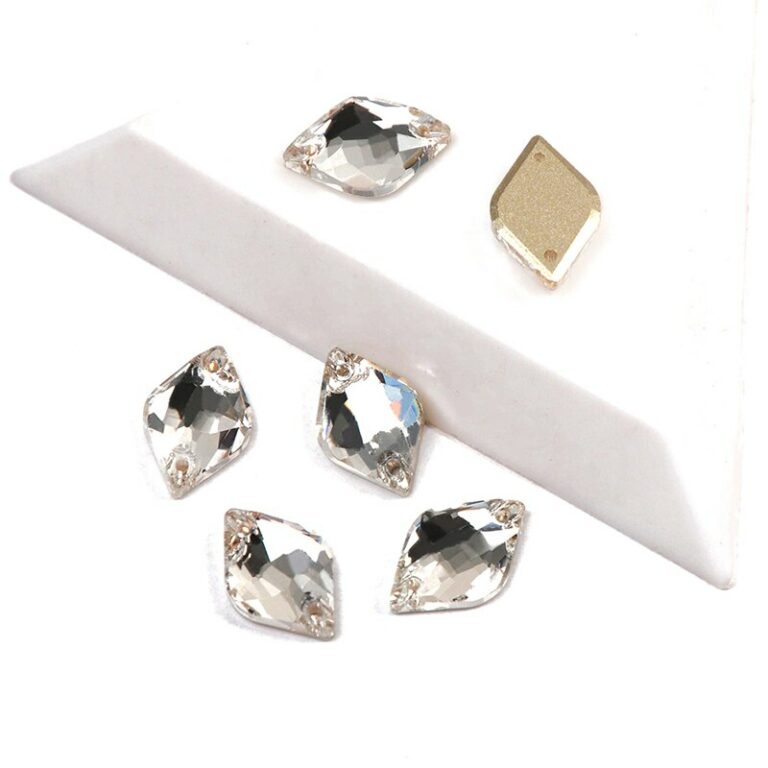 Keskeny téglalap alakú varrható kristálykő kristály színben, 6x17,5, 7x21, 9x25,5 mm-es méretben. Különleges csiszolású kő. Anyaga: kristályüveg.