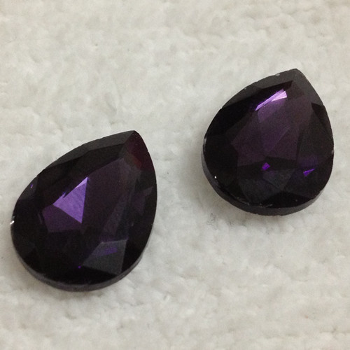 Csepp alakú foglalatos kristálykő sötétlila színben, 13x18 és 20x30 mm-es méretben, 3 D-s csiszolással. Anyaga: kristályüveg.