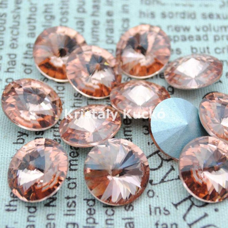 Kör alakú, rivoli metszésű foglalatos kristálykő barack színben, 16 mm-es méretben, ezüstszínű foglalattal, 3 D-s csiszolással. Anyaga: kristályüveg.
