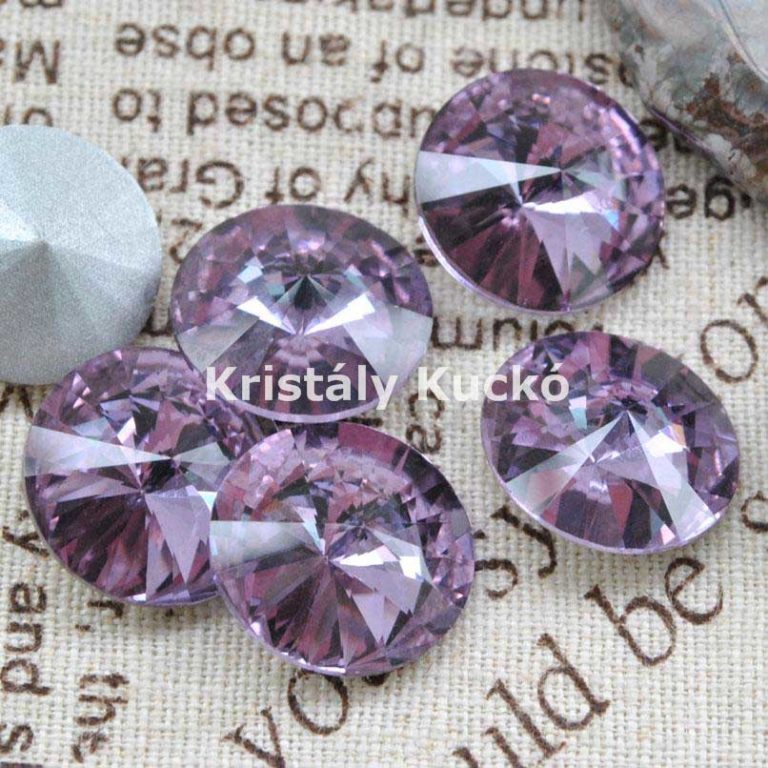 Kör alakú, rivoli metszésű foglalatos kristálykő világoslila színben, 16 mm-es méretben, 3 D-s csiszolással. Anyaga: kristályüveg.