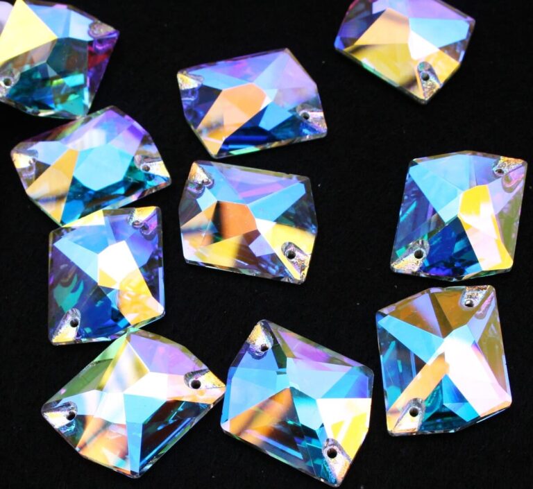 Tört rombusz alakú varrható kristálykő kristály AB színben, 11x14, 14x18, 16x20, 21x26, 27x34 mm-es méretben. Szikrázó fényű kő. Anyaga: kristályüveg.