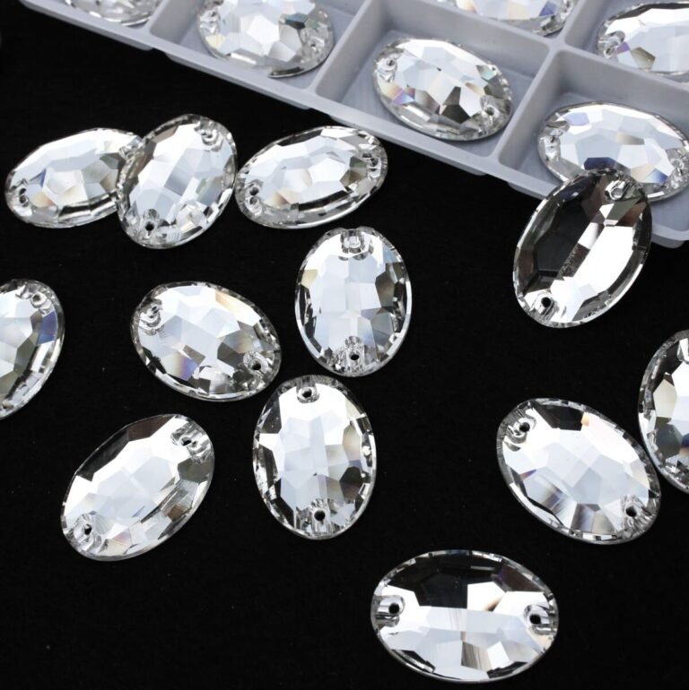 Ovális alakú varrható kristálykő kristály színben, 10x14, 11x16, 13x18, 17x24 mm-es méretben. Csillogó, prémium csiszolású kő. Anyaga: kristályüveg.