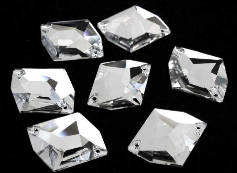 Tört rombusz alakú varrható kristálykő kristály színben, 11x14, 14x18, 16x20, 21x26, 27x34 mm-es méretben. Szikrázó fényű kő. Anyaga: kristályüveg.