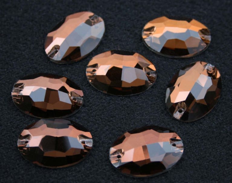 Ovális alakú varrható kristálykő világos arany színben, 11x16, 17x24 mm-es méretben. Csillogó, prémium csiszolású kő. Anyaga: kristályüveg.