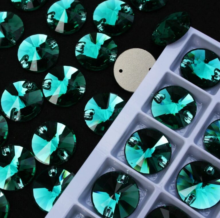 Kör alakú varrható kristálykő smaragdzöld színben, 10, 12, 14, 16, 18 mm-es méretben. Szikrázó fényű, prémium csiszolású kő. Anyaga: kristályüveg.
