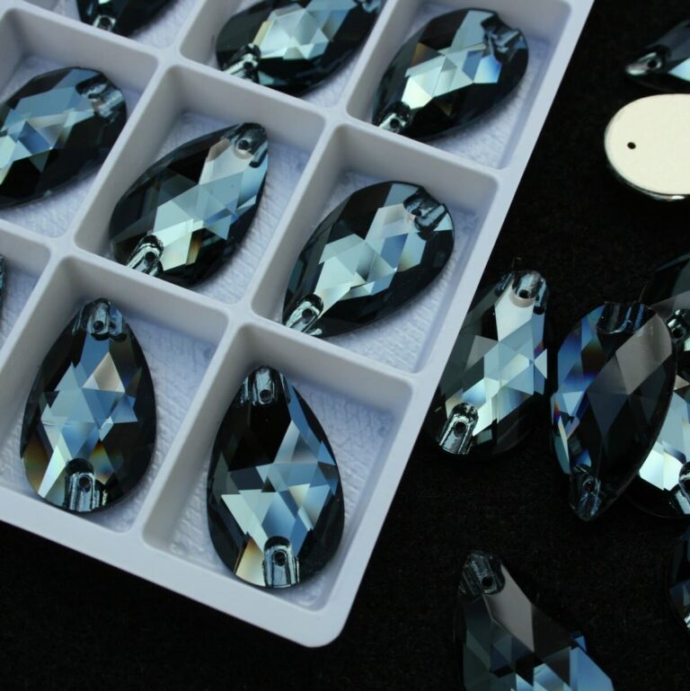 Csepp alakú varrható kristálykő éjkék színben, 10,5x18, 17x28 mm-es méretben. Szikrázó fényű, prémium csiszolású kő. Anyaga: kristályüveg.