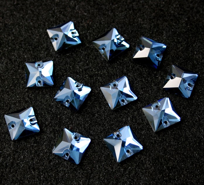 Négyzet alakú varrható kristálykő éjkék színben, 12x12, 16x16 mm-es méretben. Szikrázó fényű, új, prémium csiszolású kő. Anyaga: kristályüveg.