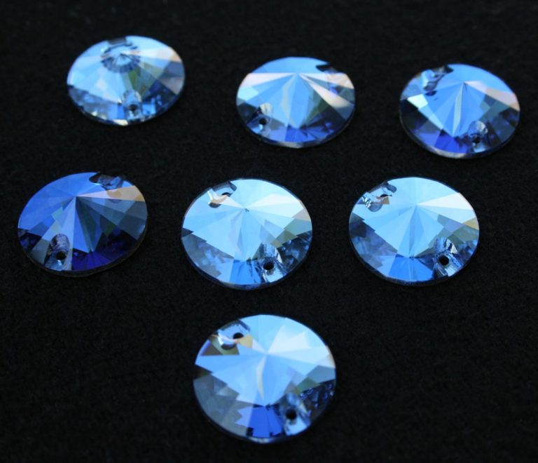 Kör alakú varrható kristálykő kék színben, 10, 12, 14, 18 mm-es méretben. Szikrázó fényű, prémium csiszolású kő. Anyaga: kristályüveg.
