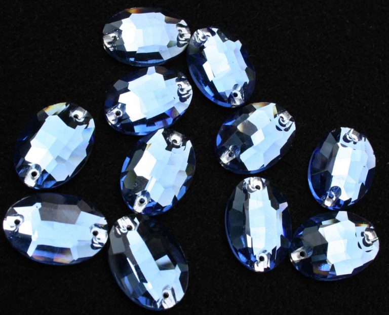 Ovális alakú varrható kristálykő kék színben, 11x16, 17x24 mm-es méretben. Csillogó, prémium csiszolású kő. Anyaga: kristályüveg.